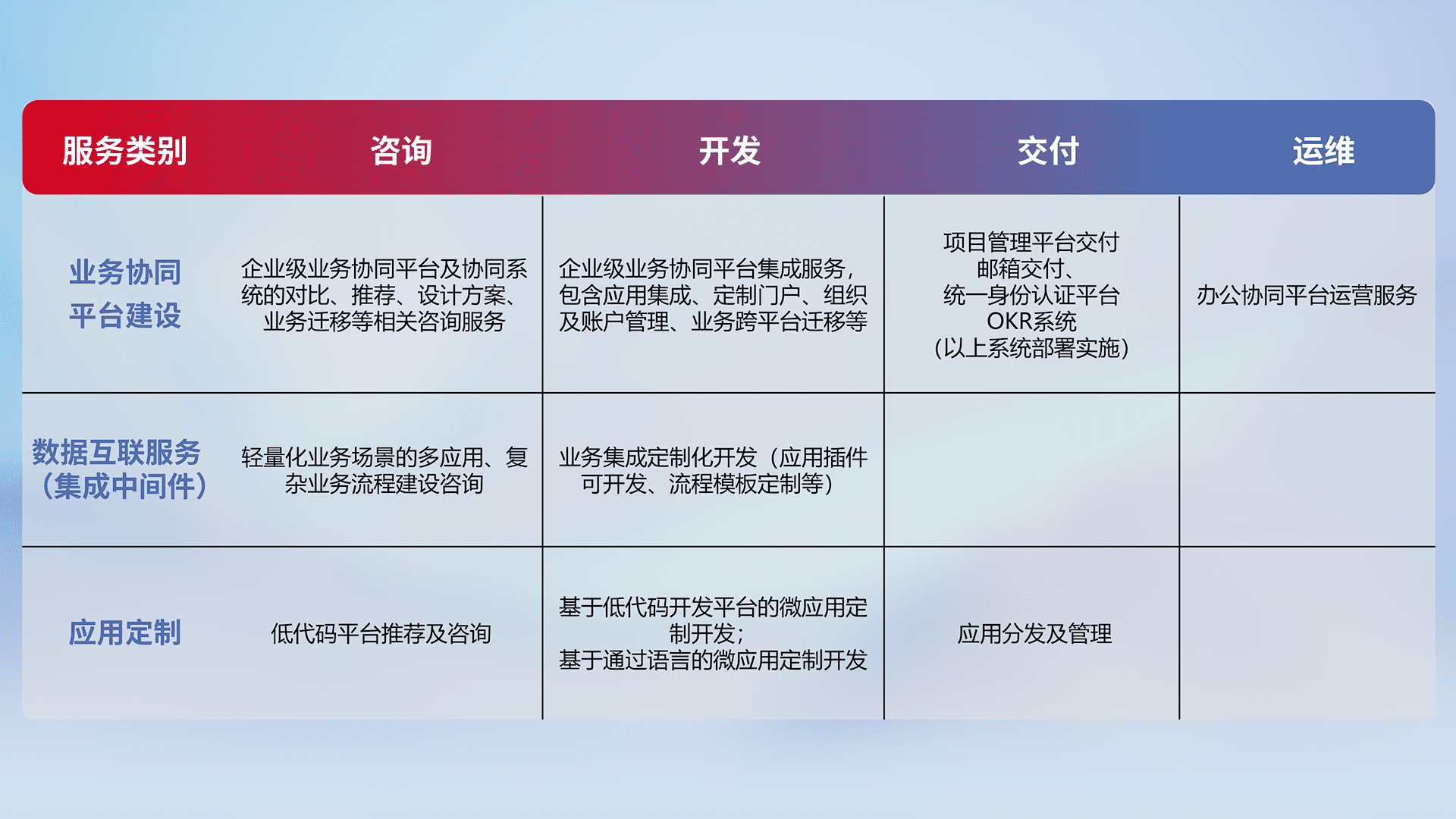 针对钉钉、、企微、、、IDaas等平台级产品提供产品的规划、、、方案、、、、交付、、、定制化开发等服务,,,实现如统一协同办公、、、、智能客户服务、、混合会议管理、、、、智能数据查询、、、等业务场景,,实现数字化转型。。