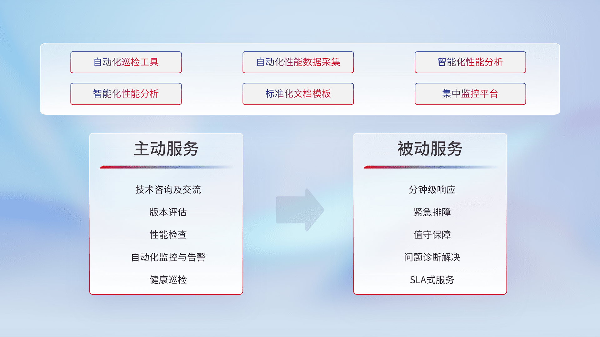 智能化工具和标准化文档,,保障服务质量,,,,提供主动服务(包含技术咨询、、版本评估、、性能检查、、、、自动化监控与告警、、、健康巡检)和被动服务包含(分钟级响应、、、、紧急排障、、、值守保障、、、问题诊断解决、、、、SLA服务)。。。。